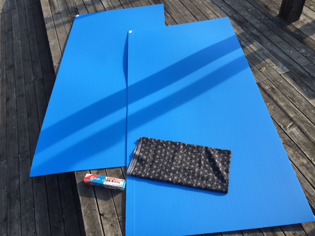 接着剤で生地をプラダンに貼って